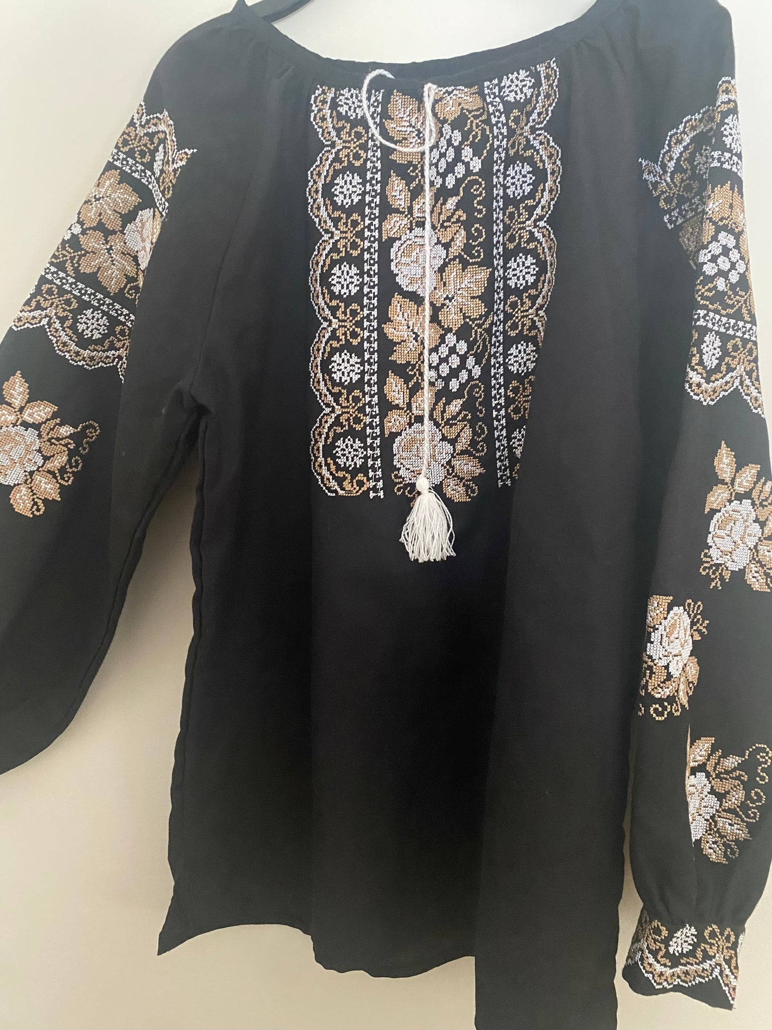 Women's embroidered vyshyvanka ,scoop neck beautiful black cotton with natural and white floral cross stitch embroidery on bodice and full on sleeves. A work of art . Made in Ukraine,