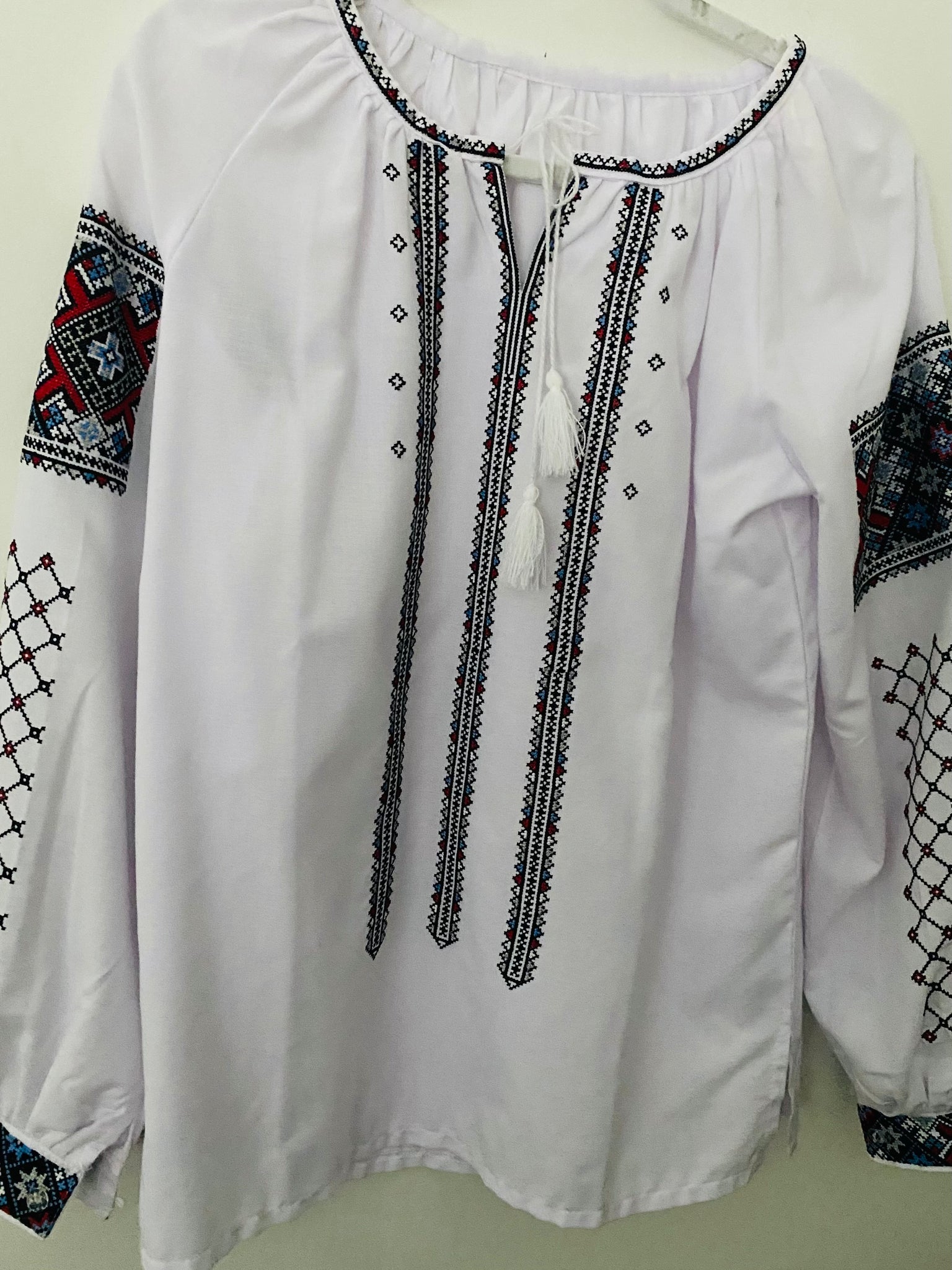 Womens long sleeve cotton scoop neck with draw string embroidered vyshyvanka with red,blue and black embroidery on sleeves and bodice. Made in Ukraine   style # 395