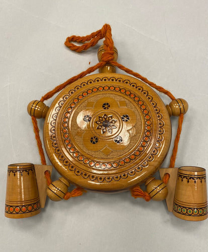 Wooden carved and painted round canteen with 2 cups