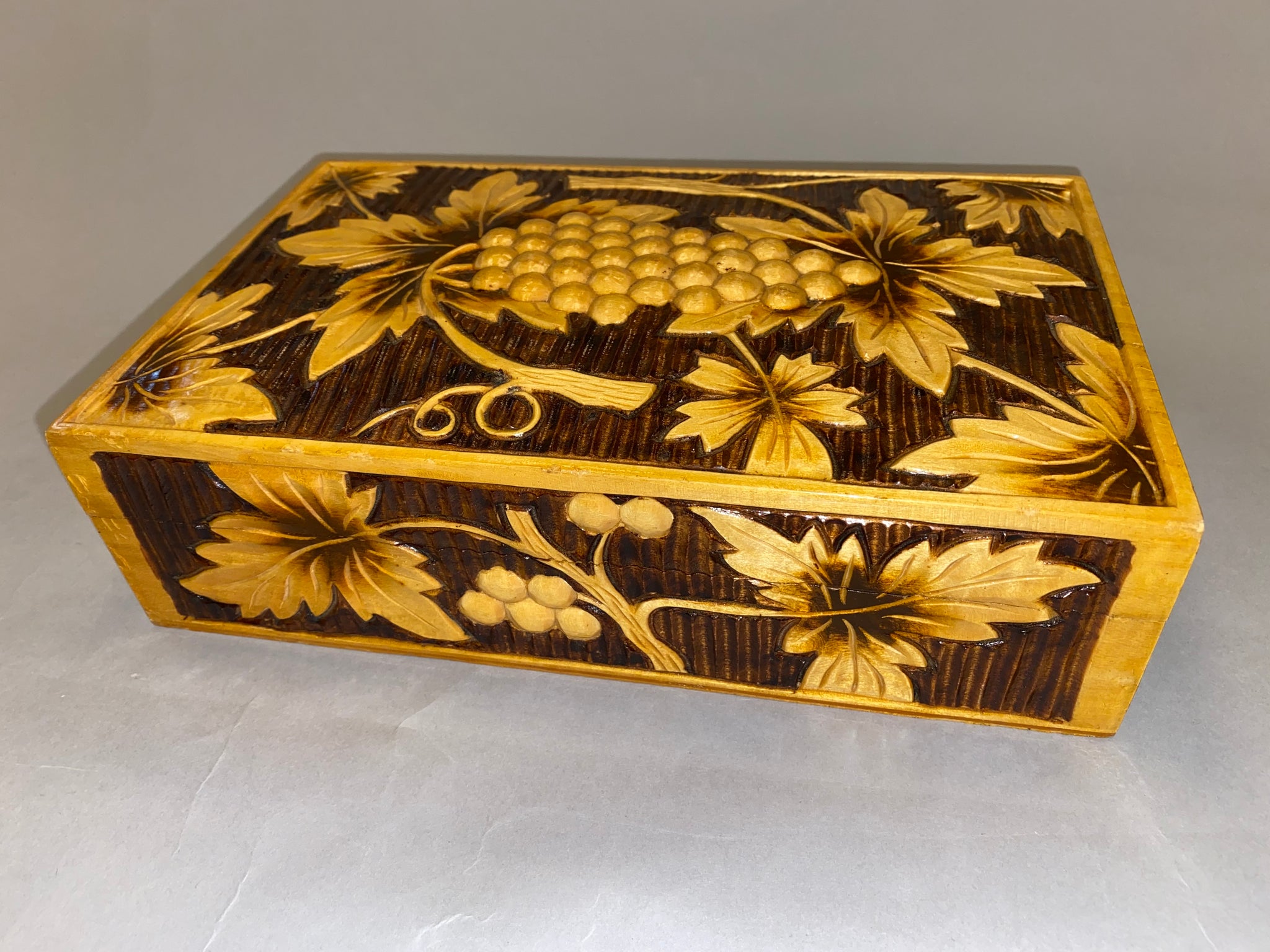 Beautiful wooden hand carved square cassetka ( box) ,with carved grapes and leaves all around,velvet lined